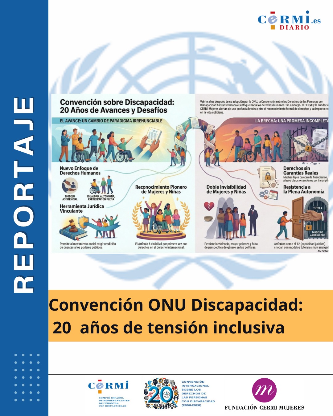 Veinte años después de su adopción, la Convención sobre los Derechos de las Personas con Discapacidad afronta un momento decisivo. El cambio de paradigma que introdujo es hoy incuestionable, pero su impacto real sigue siendo desigual y vulnerable a retrocesos. Desde la mirada del movimiento social organizado, el CERMI advierte del riesgo de vaciamiento progresivo de los derechos reconocidos, mientras que la Fundación CERMI Mujeres señala la persistencia de desigualdades estructurales que afectan de forma específica a mujeres y niñas con discapacidad. Dos claves que permiten entender por qué el 20º aniversario de la Convención no es una celebración, sino una llamada política a reforzar su cumplimiento efectivo en un contexto internacional cada vez más adverso.